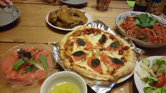 今年ゎ私のリクエストでサーモンの燻製(#^.^#) コレってワインに合うんですネェ(#^.^#) またまたピザにパスタ!おまけに手羽先と、もぅ酒が進むモンばっか(*^_^*)