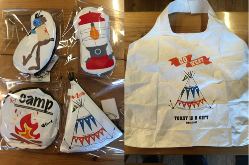 デザインはココペリ、ランタン、ティピ、焚火(なぜかキャンプ⁉)で同じ柄のポーチ付きですョ 買い物もお洒落に行きたいもんですネ