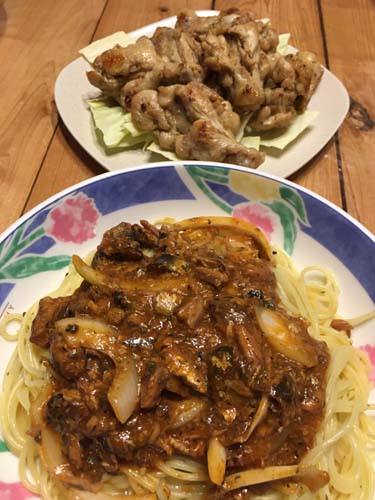 ド~ン!! イワシの缶詰を混ぜたパスタとスパイシーチキンなり。昼間に麺に大盛り飯に団子まで食べて夜にまたの炭水化物!!