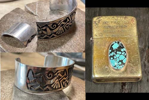 幅があるしロウ付けした後に模様が消えるから彫り直したりと大変でしたョ んで隣のオイルライターね。ターコイズを貼り付けて欲しいとのオーダーでした。