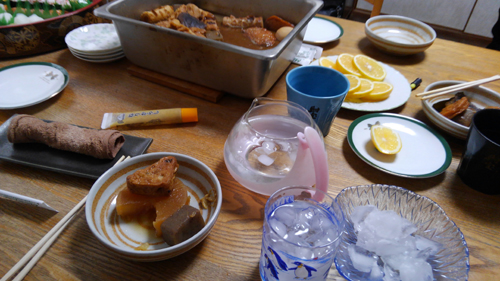 その後、酔い気持ちになり地元探索をし古い旅館の入口にライトで照らされた綺麗なオネィさんを拝見し(入ってませんョ)いつものジャンジャン町でまた一杯。
