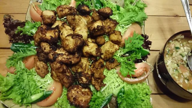 となりの椀に入れてあるのが玉ねぎにキュウリ、トマトを使ってスパイス仕込みのソース!? なんですョ コレを野菜やから揚げに乗せて食べるんですけど完璧なまでの多国籍料理!!