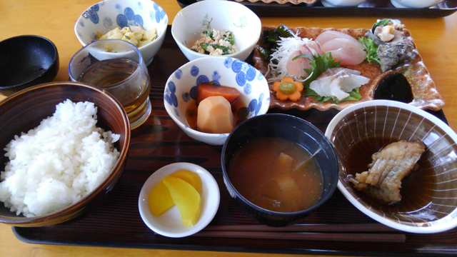 じゃ~ん!刺身の盛り合わせにアラ煮。小鉢にニンジン&芋の煮っ転がしにホウレンソウやキャベツの和え物まである!