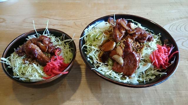 コの小さい方が普通サイズです。で、ゴハンにキャベツ、ニンニクにタレと肉以外ゎ全て大盛りにしてくれます。こんなに量が違ってもサービスなんですネ( ̄m ̄*)