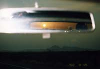 この光景も日本じゃ、とても見れません。地平線に沈む夕陽をルームミラーで撮ってみました。