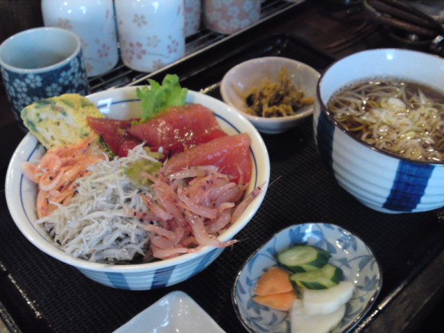 マグロの刺身に桜えびの釜揚げと佃煮。それに蕎麦かうどんが選べてゴハンお代り自由。コレでなんと¥1380なり(安い