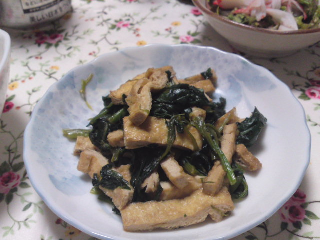 奥さんお手製の(家庭菜園で出来たやつネ)菜っ葉のおかず。昔を思い出す懐かしい香りが口の中に広がります