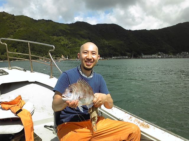 まぁ~なんとも嬉しそうな顔してますねェ いや、ヤッパ真鯛を釣り上げると誰でも嬉しいんですョ 真鯛独特の竿が海に沈みこまれそうになるくらいの強烈な引きゎたまりません(*´▽`*)