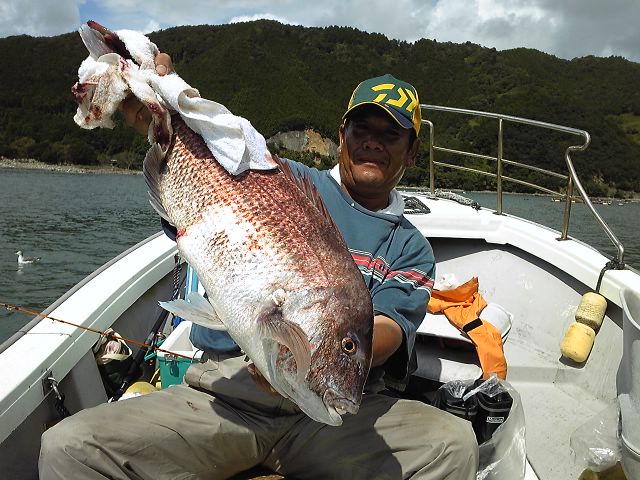 前半ゎバラしてばかりで調子の出なかった、いつも同行してるけどBlog初登場の“草”(車屋さん自営。一応名前ゎまる草。おぃ宣伝してやったゾ) が、よぅやく1枚目の真鯛をゲット!!