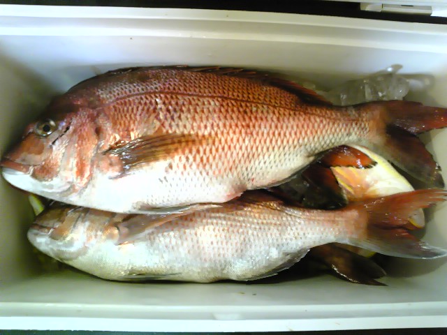60cm級二枚、50cm級二枚、40cm級三枚の計、真鯛七枚。コの他アジやらサバやらでクーラーいっぱいデス 当分食費助かりますから女房も大喜び