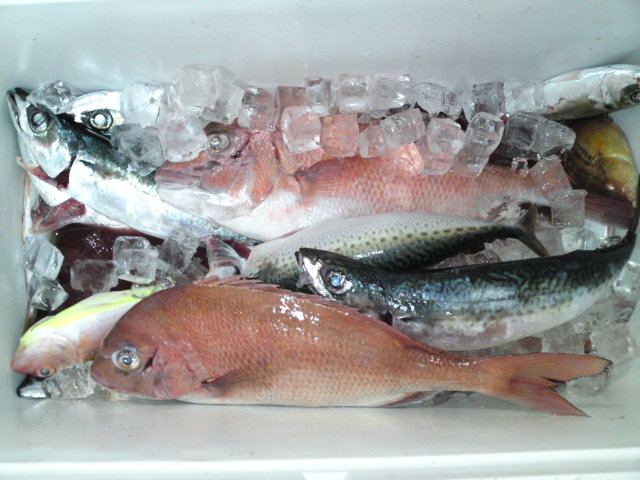 50cmの真鯛二匹と25cm級のアジが十数匹、サバが数十匹と大漁にゴキゲンですが捌くのが大変(^_^;) でも、それも釣りの楽しみデス