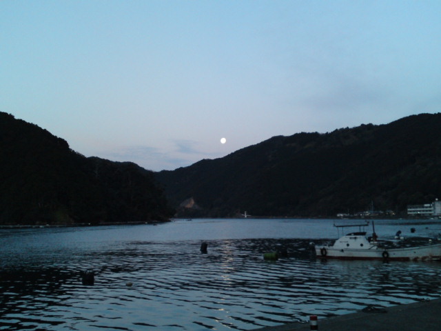 冬場は日の出が遅いから出船もゆっくりめ。そんな、のどかな須賀利の漁港にゎ沈む前の月がクッキリと。