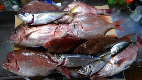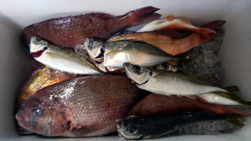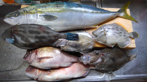 コの中に真鯛やウマズラハギもいます(^_^;) クーラーの蓋が閉まらなくなり仲間のクーラーに入れたりオスソしたりと大漁デス!!