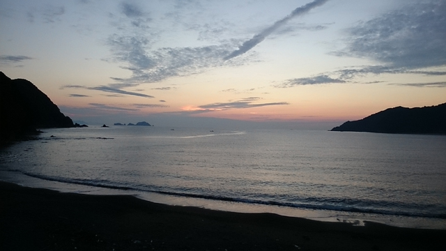 須賀利町に行くまでの海岸風景。もぅすぐ朝日が昇ります。特に心配してた台風の影響もなさそぅで波も穏やかです! なんか釣れる気がしてテンションUp!!