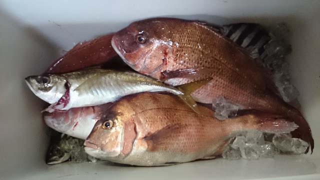 真鯛4匹、30~40㎝級の大アジが約10匹でクーラーも賑やかになりました(*^_^*)