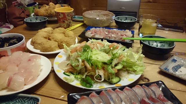 釣りの日ゆえの御馳走の数々(*^_^*) 鯛やアジの刺身に、お寿司。フライにカルパッチョと魚料理のフルコースです(*^_^*)