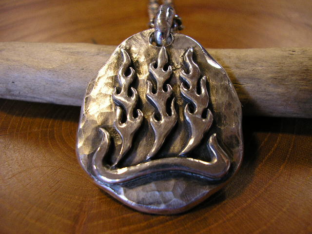 結構ゴツめのペンダントTOPでございます。手書きしてからノコでシコシコと切り、仕上げを色んな先端工具使って平面を立体化したフレアーを叩き出しのプレートに貼り付けてあります。