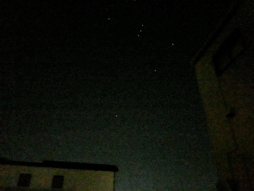 左下の家は我が家と同じく細長い家なんですョ で、左の屋根からオリオン座が現れます。12月に入った頃ですけど徐々に上がってきます。時間は毎夜7時半ころです。