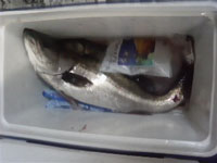 このスズキ漁はルアーを船で引っ張りながらのトローリング漁方で釣ります。一時間くらいはボウズのまんまでしたが時合いと共に大当たりし入れ食い状態に。