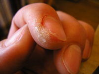 こんなんなりますが、絆創膏みたいに仕事の邪魔にならんし剥げぬくいし水だって使えるしけっこう便利モンです(チト沁みますが・・・)